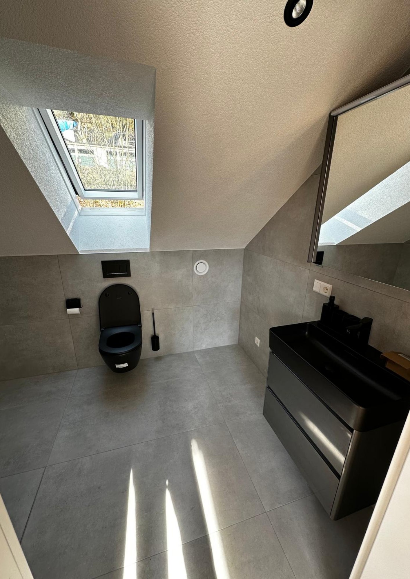 Badezimmer: Tageslichtbad: Ausgestattet mit Regendusche, Waschbecken, Spiegel und Toilette.