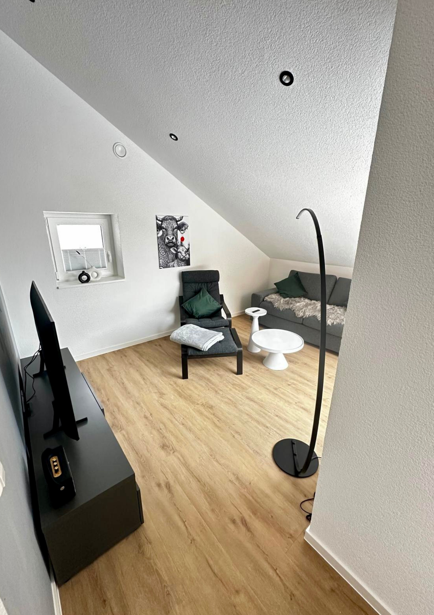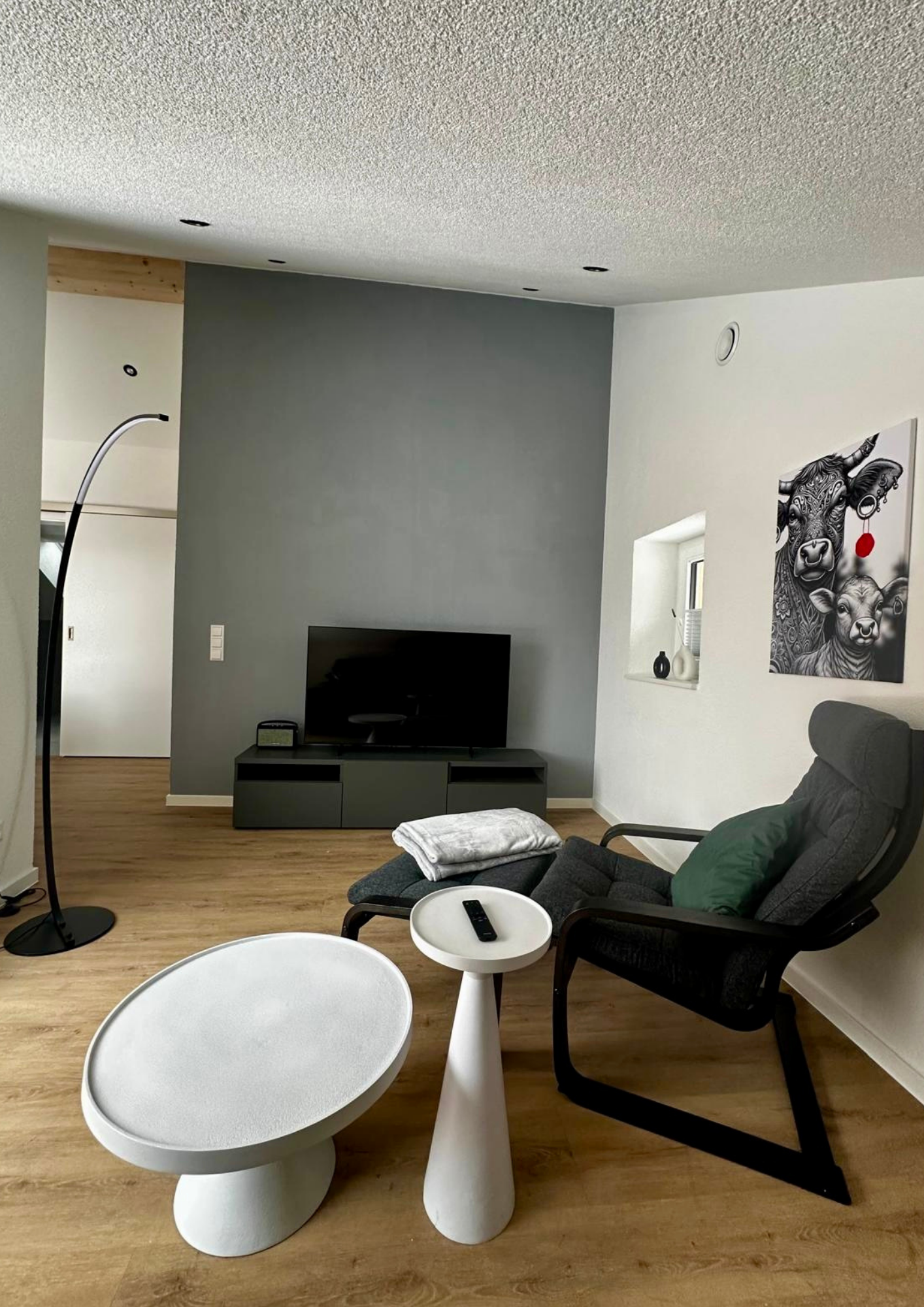 Hell und freundlich, ausgestattet mit einem Flachbild-SMART TV (einschließlich Streaming-Diensten), Side-Board mit Spielesammlungen für jung und alt, Ablagefach für Schuhe und Schuhlöffel, Bluetooth-Lautsprecher, ausziehbarem Sofa, Sessel und vielen kleinen weiteren Details. Der große Esstisch bietet Platz für die ganze Familie und lädt zu gemeinsamen Mahlzeiten ein.